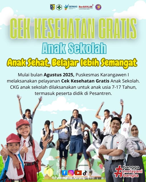 Hallo ayah bunda. Mulai tanggal 4 Agustus 2025, Puskesmas Karangawen I akan melaksanakan Cek Kesehatan Gratis Anak Sekolah ya Ayah bunda.