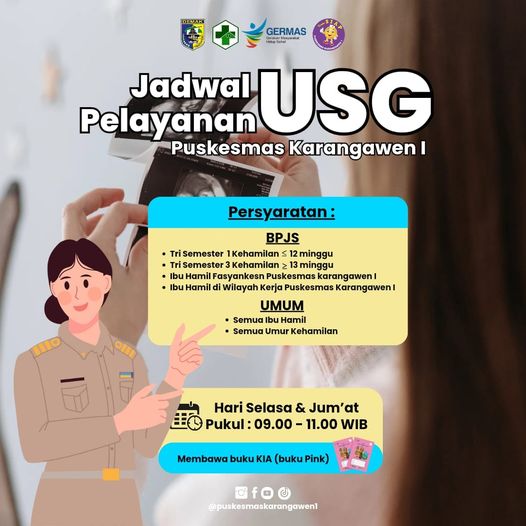 yuk periksa ke Puskesmas Karangawen I ………ini jadwal pelayanan USG di puskesmas Karangawen I ya. simpan biar tidak bingung waktu mau USG 22-11-2024
